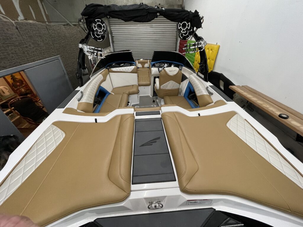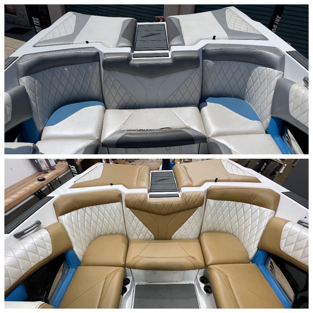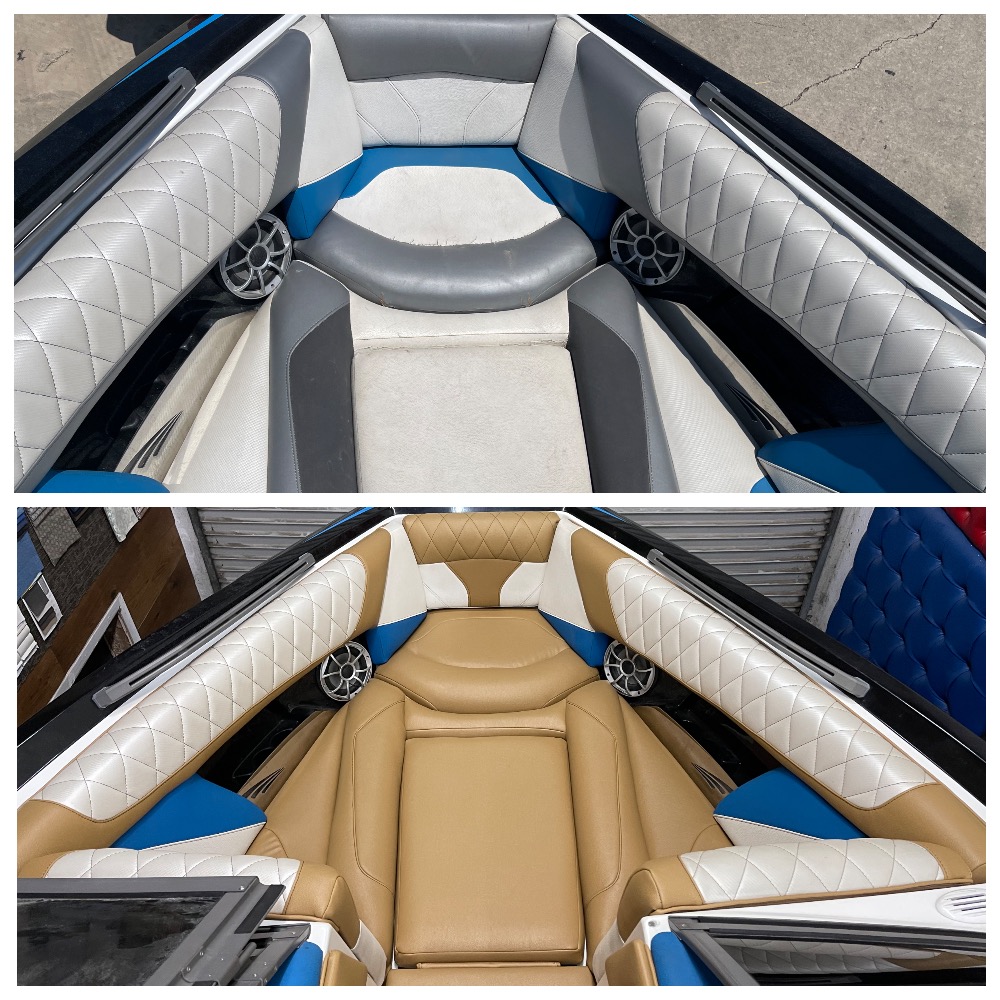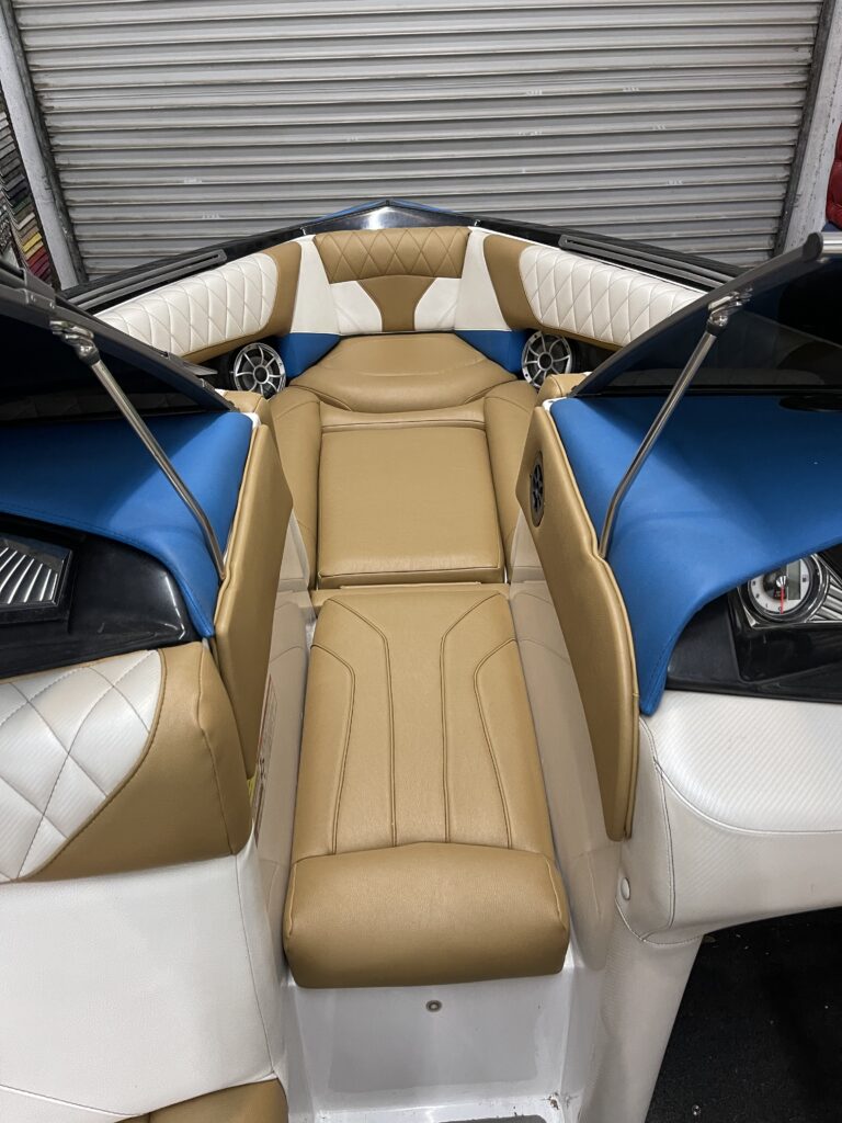 Our skilled team took on the challenge of reupholstering the boat’s furniture, replacing damaged parts and updating all the old vinyl with new, vibrant selections. We offer a wide range of options, boasting over 200 different colors of boat vinyl and about 100 colors of natural leather for interiors. This variety ensures that each restoration not only restores functionality but also aligns perfectly with the owner’s aesthetic preferences.